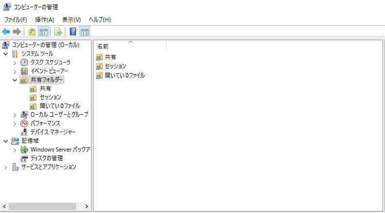 WINDOWSメニュから、「コンピューターの管理」⇒共有フォルダを選択して「右クリック」